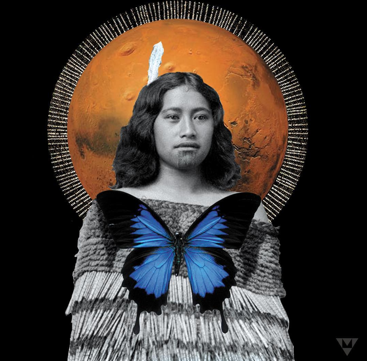 NS: I notice a lot of your work involves indigenous, women, and children, combined with mixed media images of cosmic scapes and florals. These images are very haunting (in a good way). Can you speak to why you chose these themes, especially in how they work together?